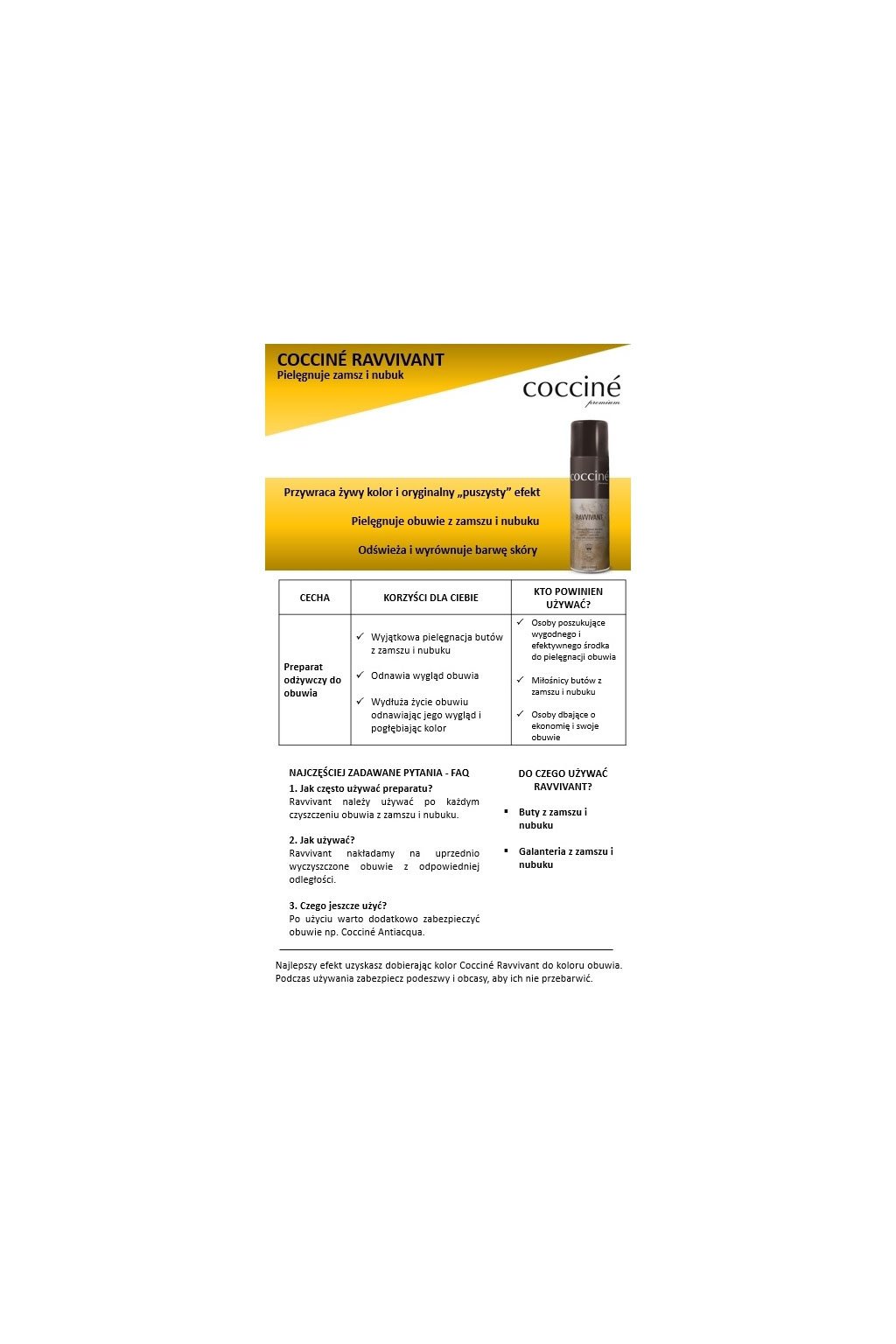 Ravvivant osvěžuje a vyrovnává tón pleti, obnovuje přirozenou barvu a originální (načechraný) efekt nubuku a semiše. Neblokuje migraci vlhkosti ven, takže se nohy méně potí. Chrání před vlivem slunečního záření na barvu pokožky.