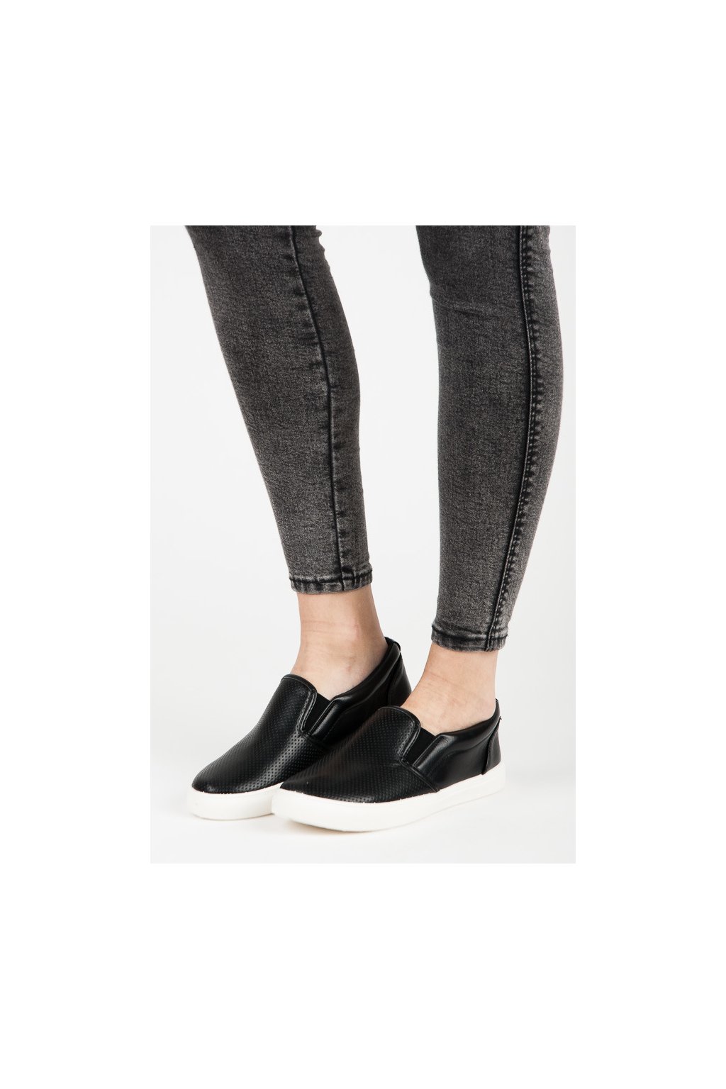 Čierne dámske módne tenisky slip on z eko kože, čipkovaný vzor, textilná vložka, zastavaná päta, kód produktu Cnb 29370-1B
